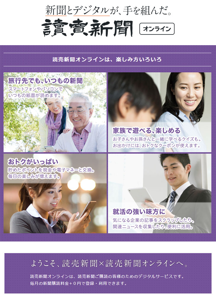 読売新聞オンラインは、読売新聞ご購読の皆様のためのデジタルサービスです。毎月の新聞購読料金+0円で登録・利用できます。